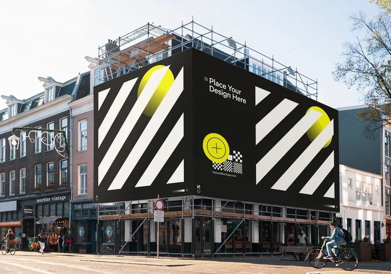 Construction scaffolding mesh banner mockup around the corner of renovated building