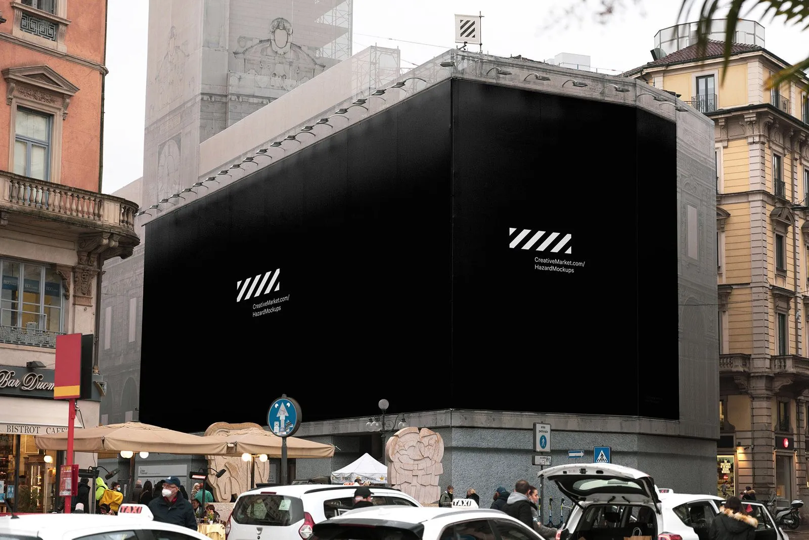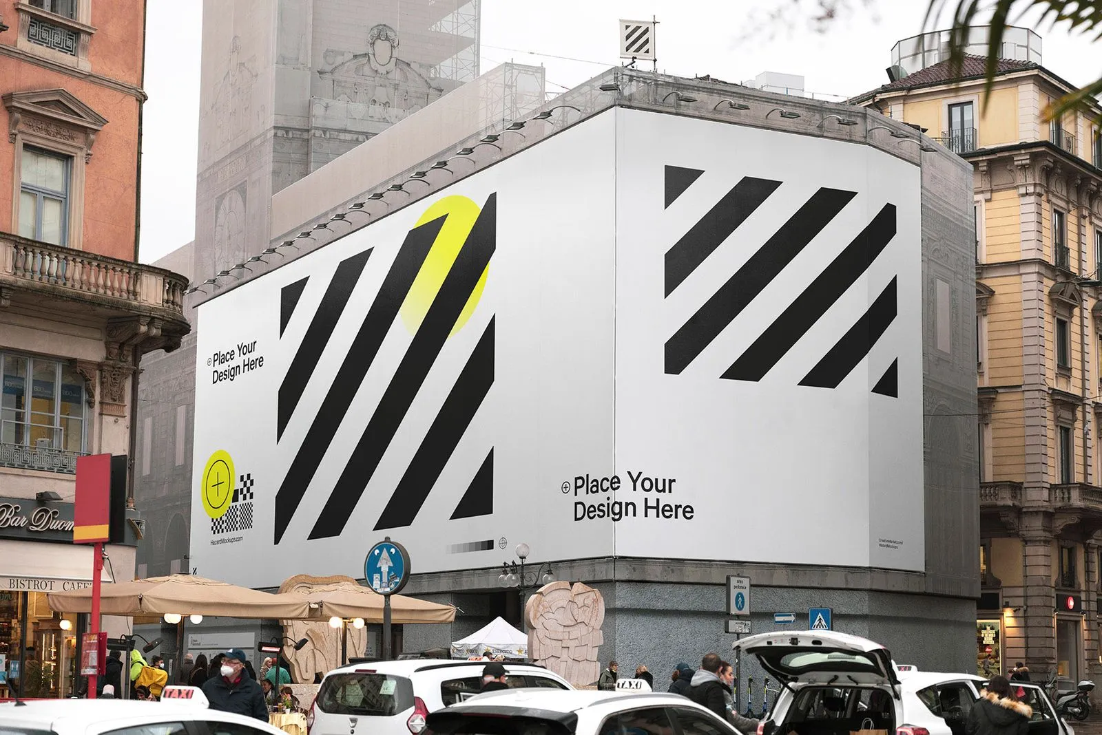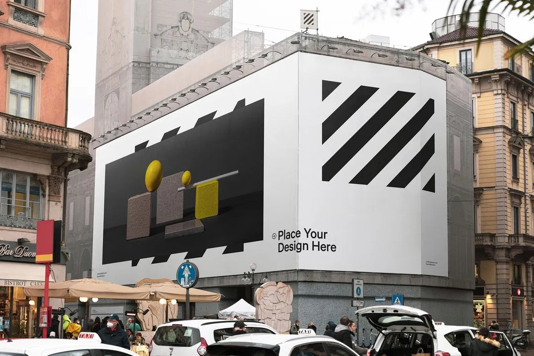 Construction scaffolding mesh banner mockup around the corner of renovated building