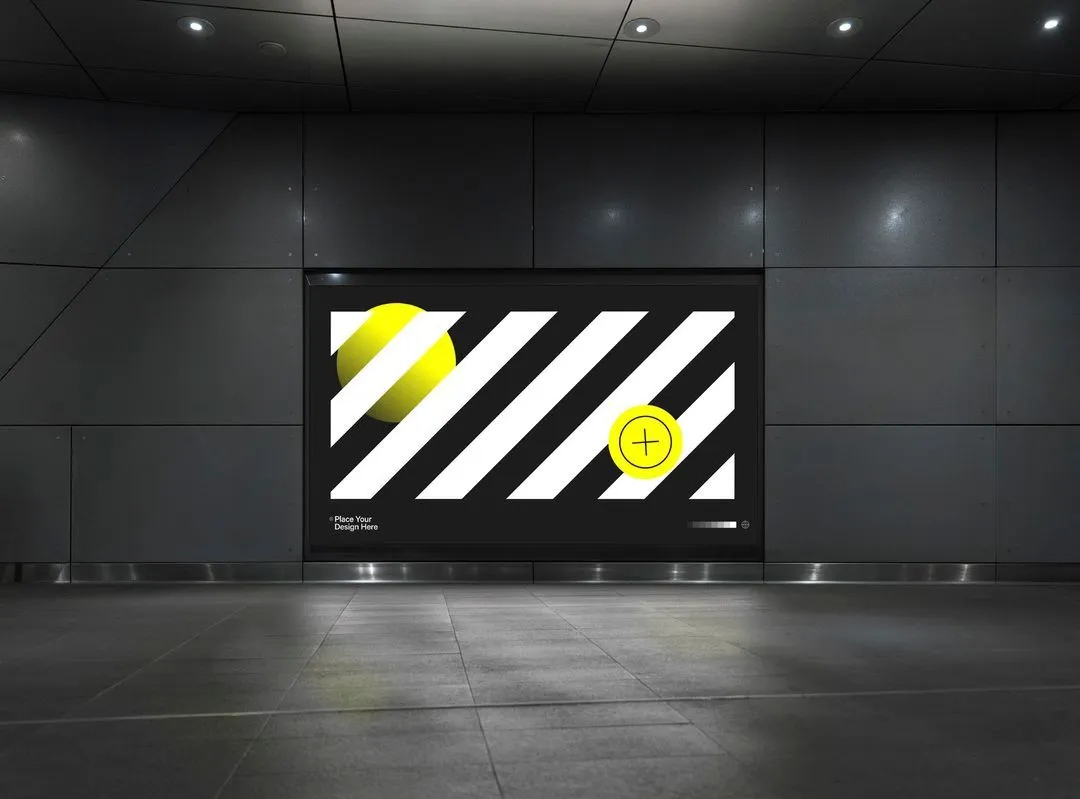 Display mockup in minimal subway station with realistic reflection. Perfect to present campaign and commercial designs.