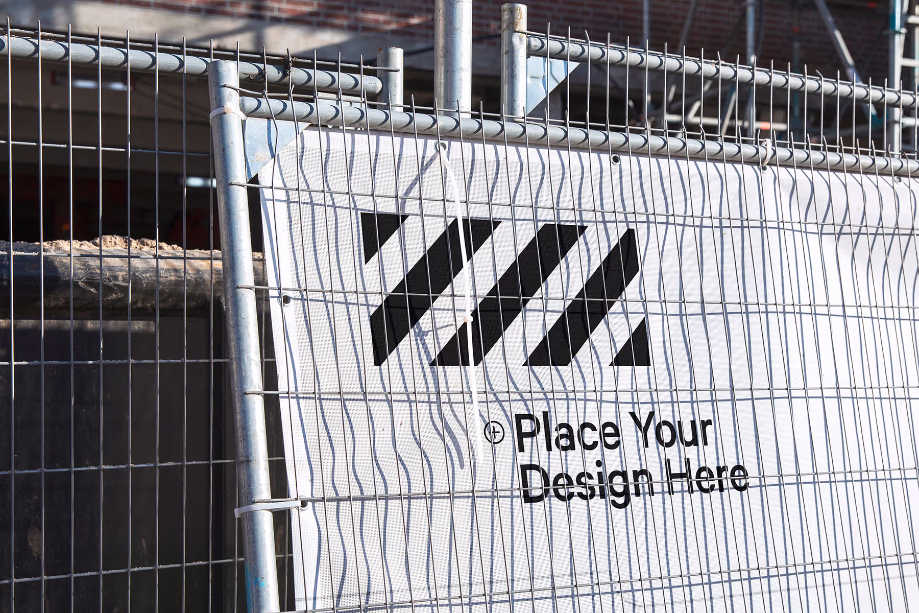 Free Construction mesh banner behind iron fence. Perfect as a logo mockup!