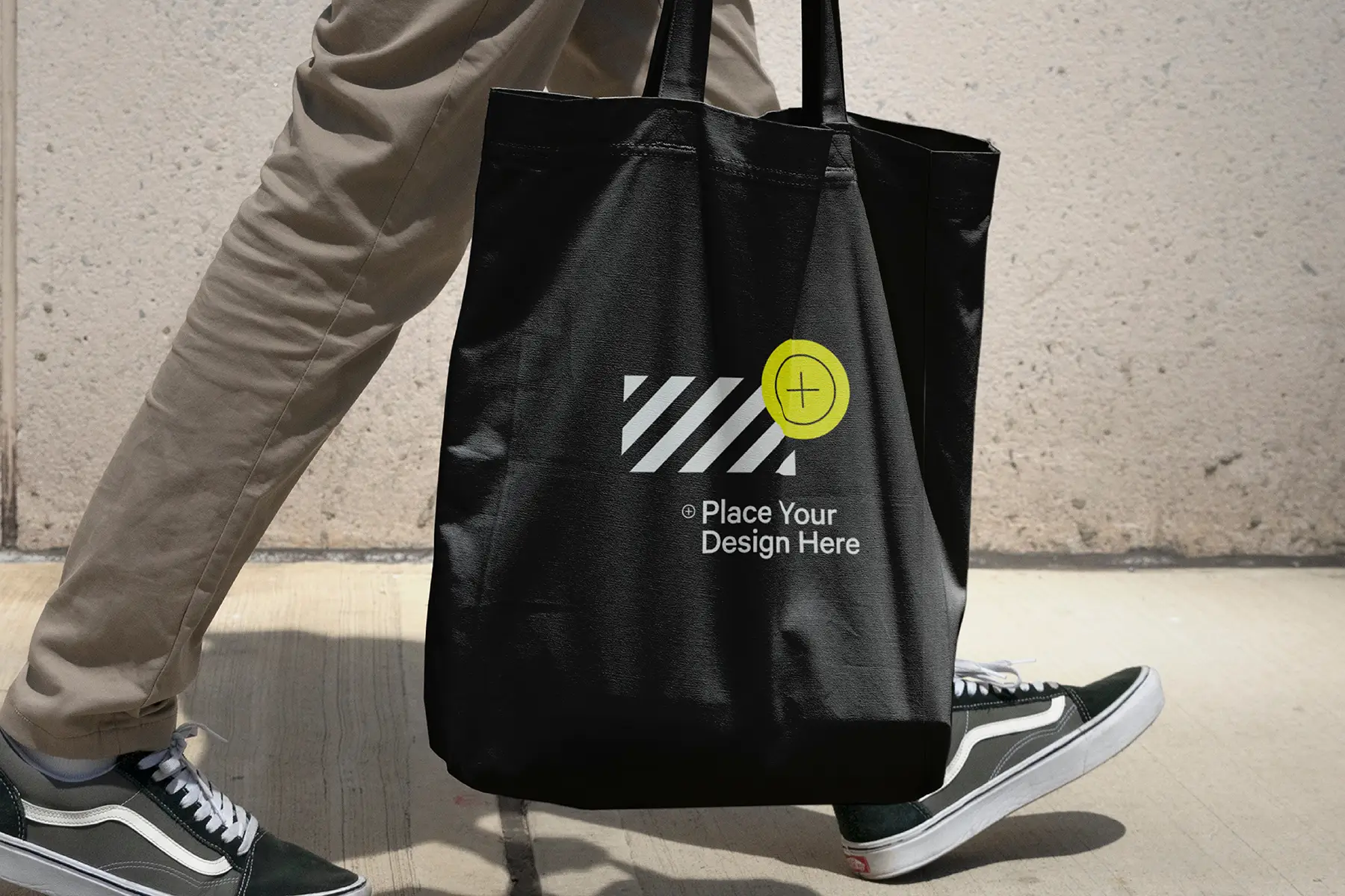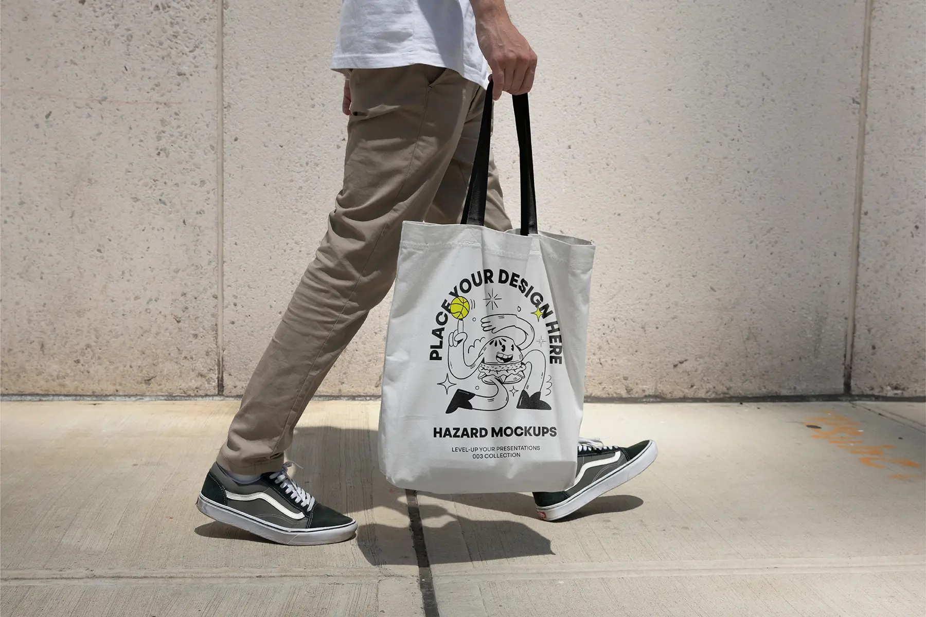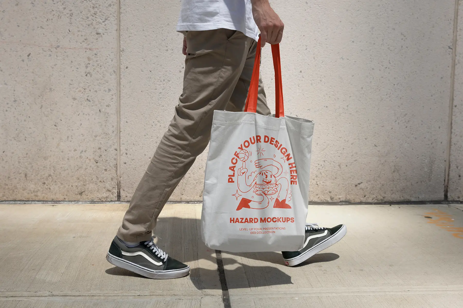 Perfect for apparel and accessory brands, this mockup showcases a model walking with a customizable canvas tote bag, allowing you to change colors and designs. Ideal for capturing an authentic urban vibe, it's great for social media, e-commerce, and marketing presentations!