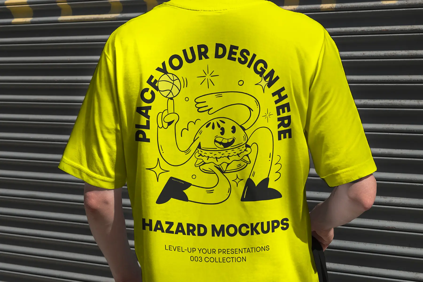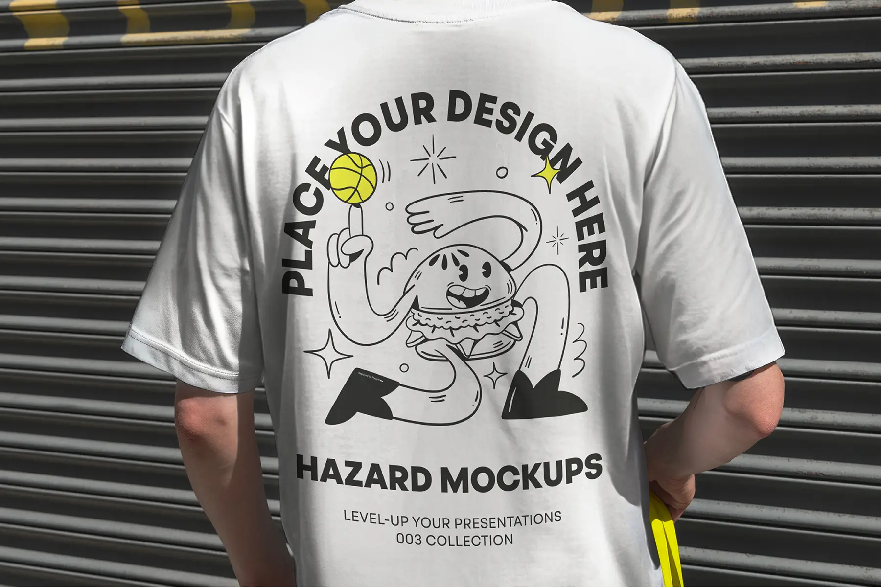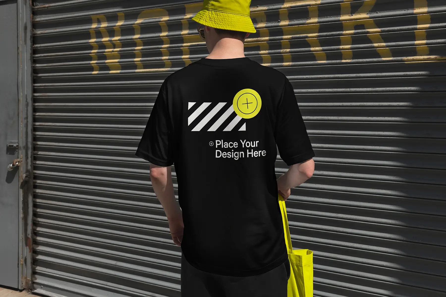 Showcase your designs with this urban streetwear mockup featuring a model standing in front of an industrial garage door. Customize the t-shirt, tote bag, and hat with any color or design to bring your branding to life. Perfect for apparel and accessory brands.