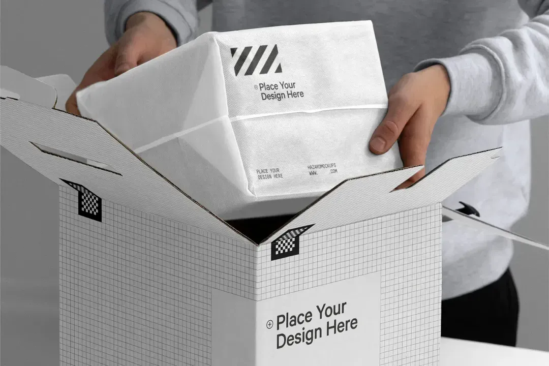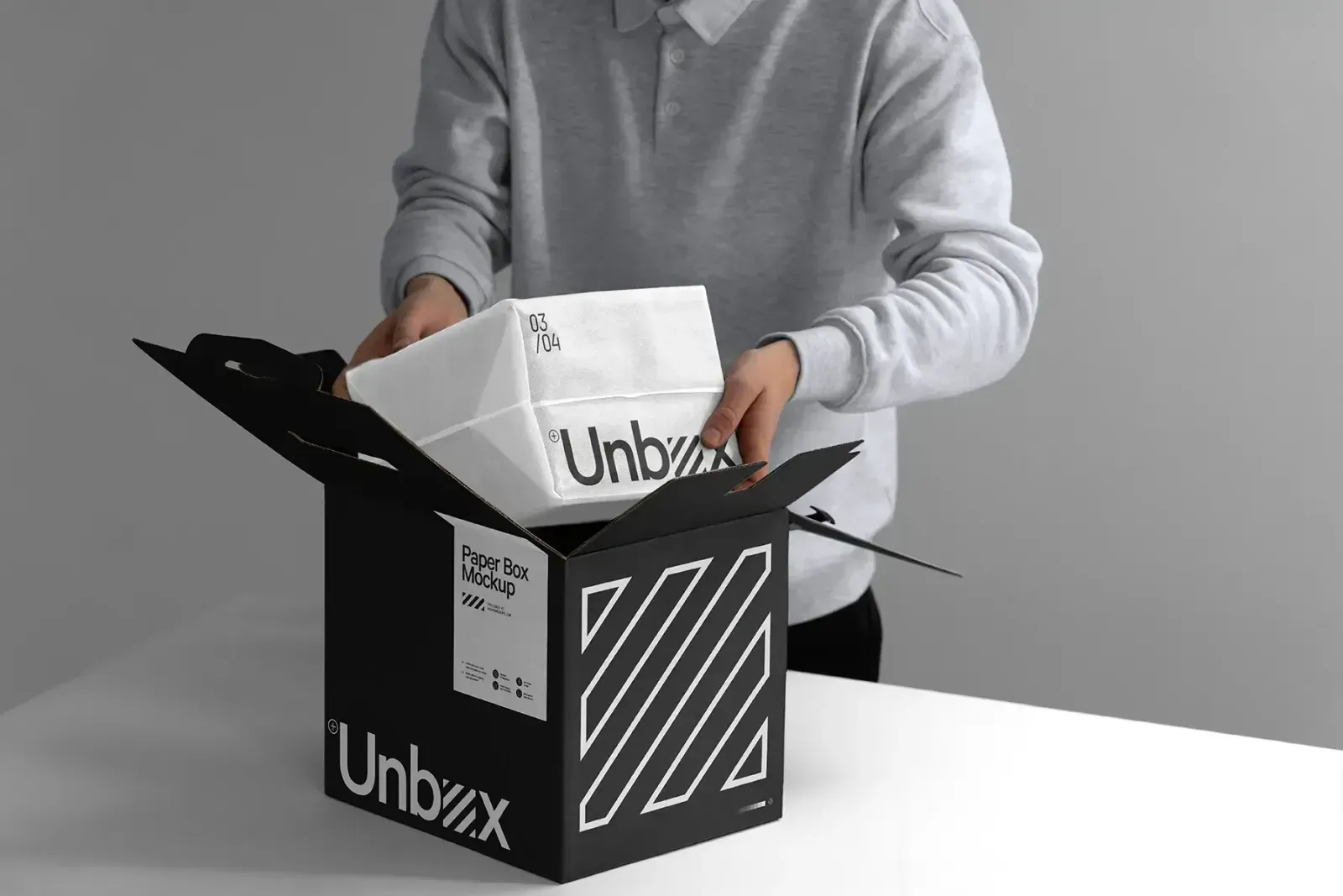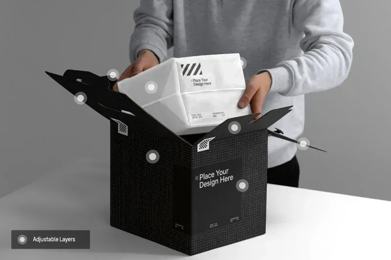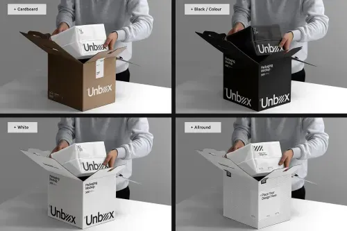 Packaging mockup containing highly editable cardboard box mockup. Customer unboxing a product in studio setting.