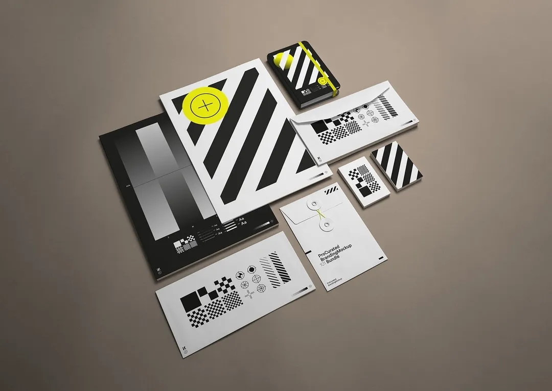 Full stationary mockup containing envelopes, bussinnescards, a4 paper and a notebook mockup