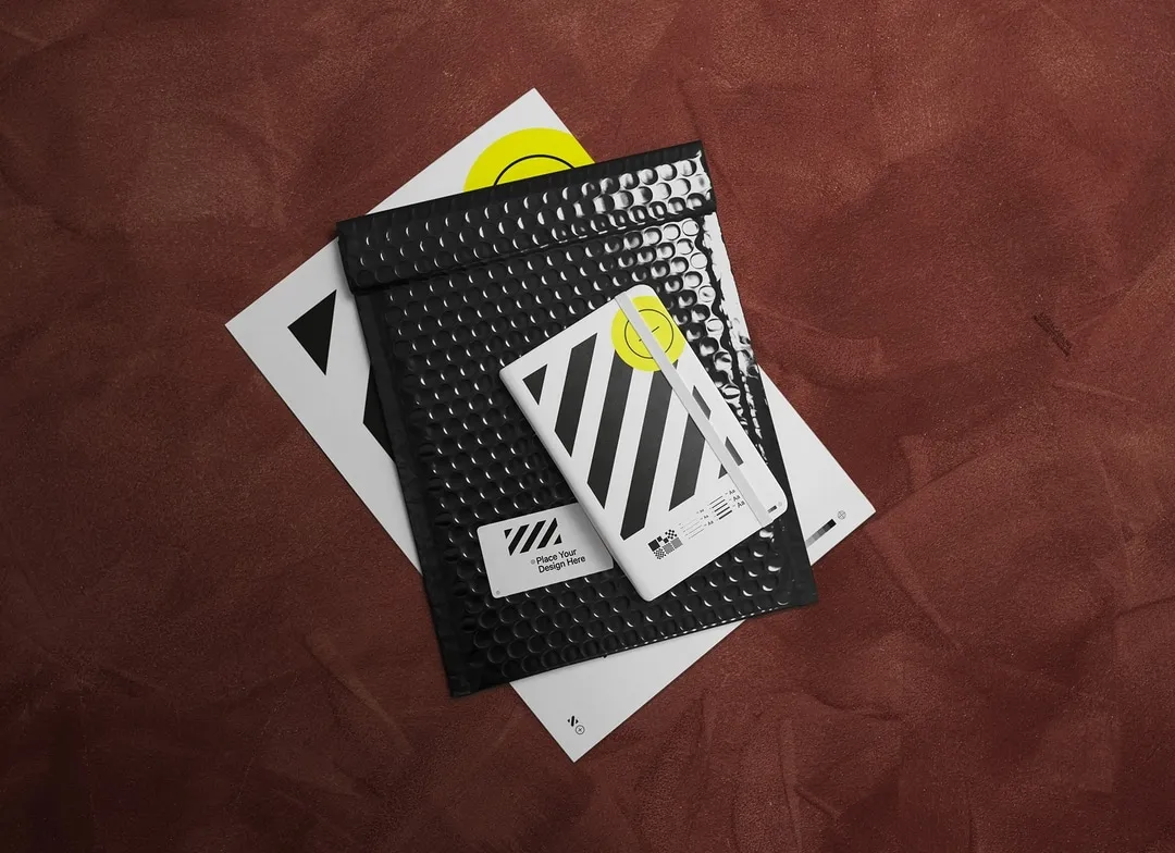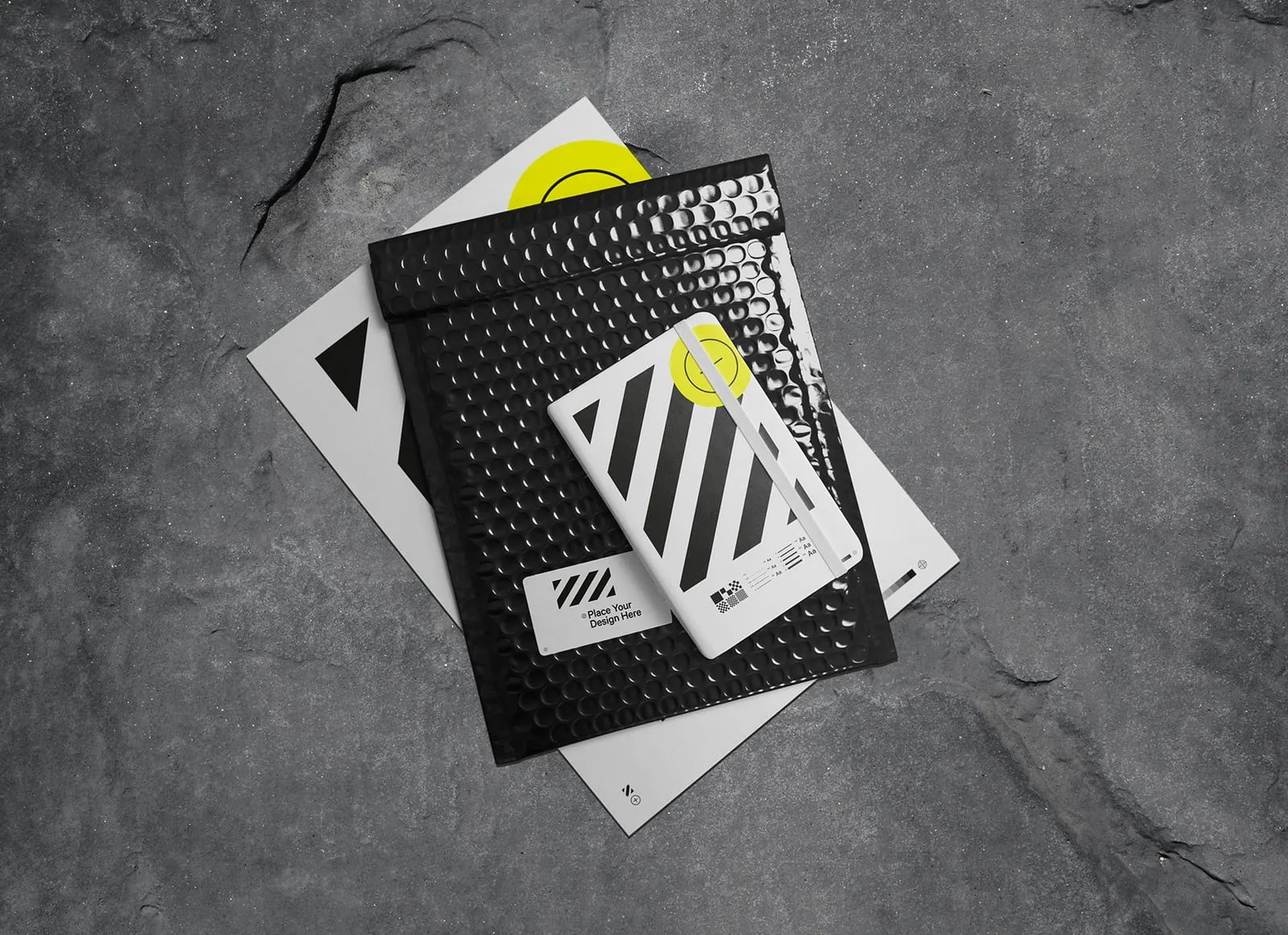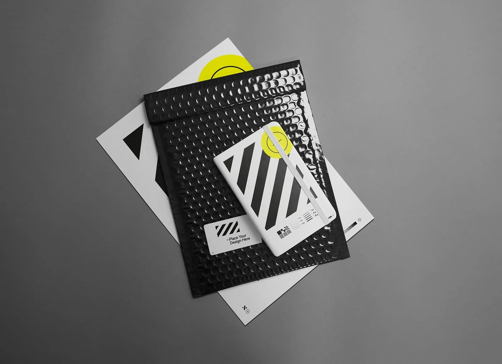 Triple mockup containing paper mockup, bubble envelope mockup and notebook mockup