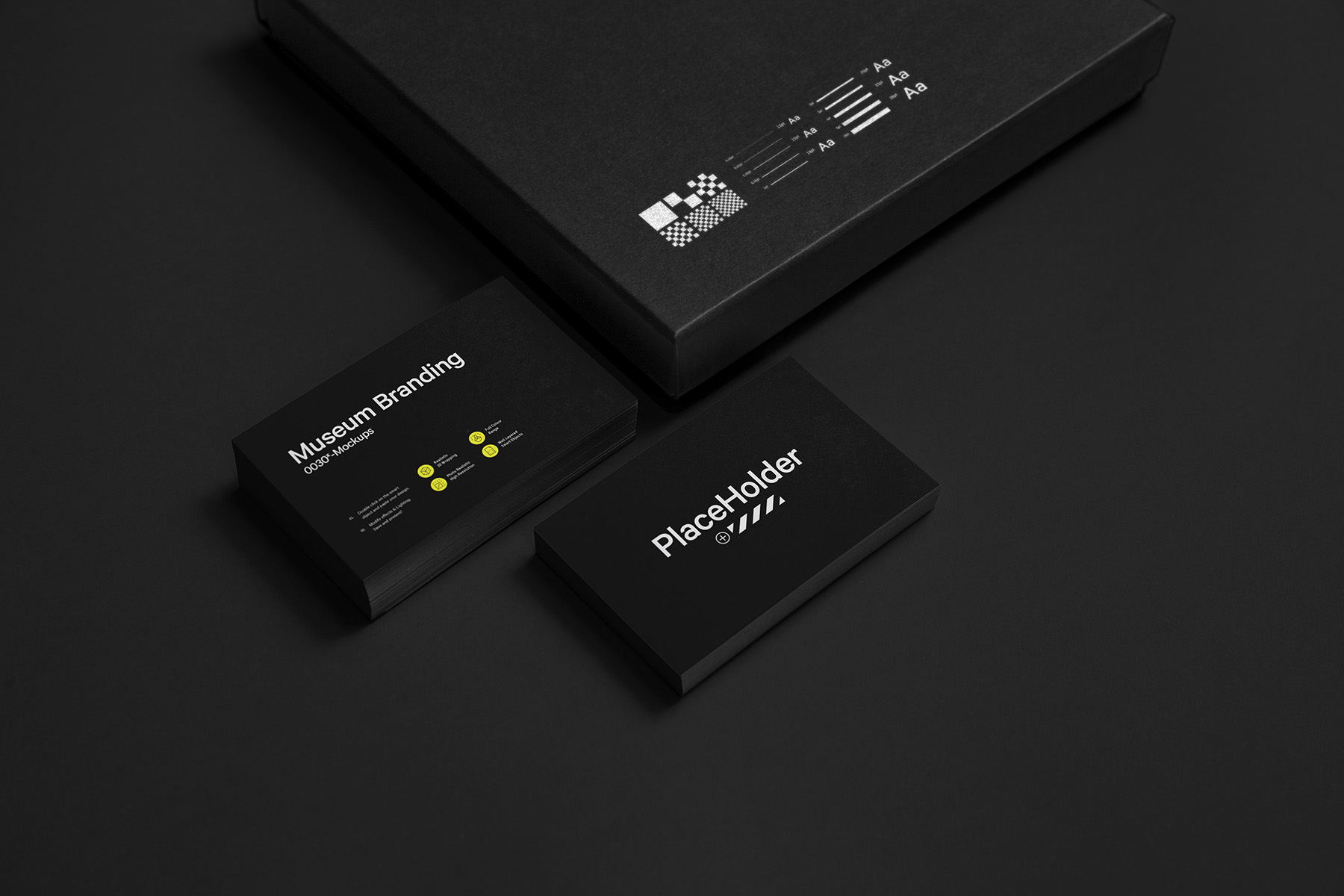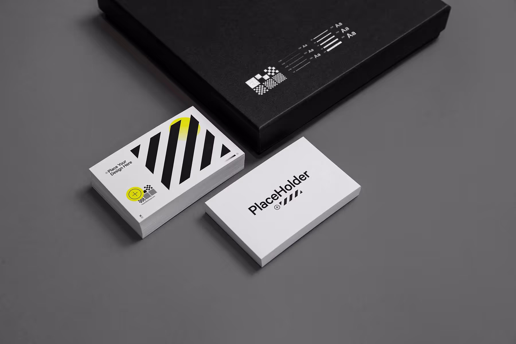 Double business card mockups including a minimal packaging box. Background and box also editable.