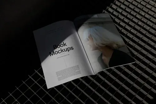 Magazine mockup on dark steel background with realistic shadow effect